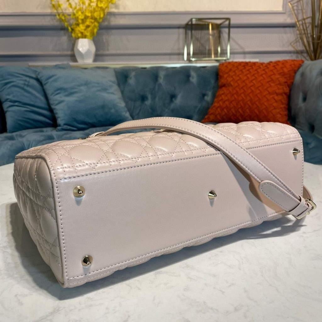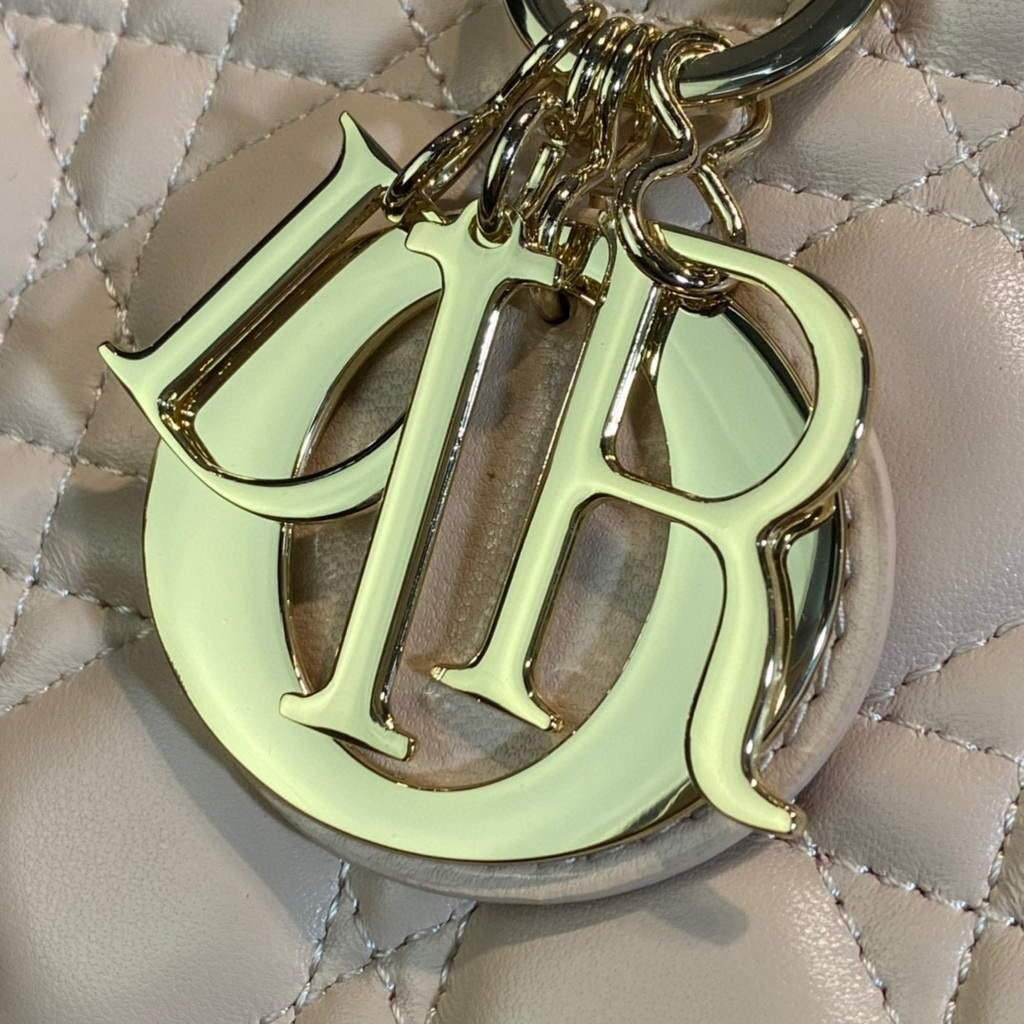 Experience elegance and functionality with the Large Lady Dior Bag. Made with luxurious Beige lambskin, it features a thin, adjustable, and removable shoulder strap for versatile carrying. Equipped with an interior zip pocket and large patch pocket for easy organization. Includes dust bag.
