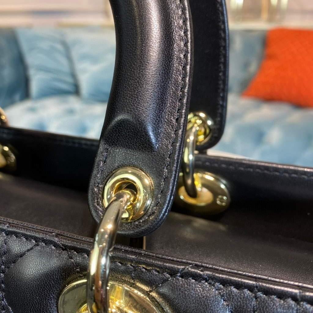 Experience elegance and functionality with the Large Lady Dior Bag. Made with luxurious Black lambskin, it features a thin, adjustable, and removable shoulder strap for versatile carrying. Equipped with an interior zip pocket and large patch pocket for easy organization. Includes dust bag.