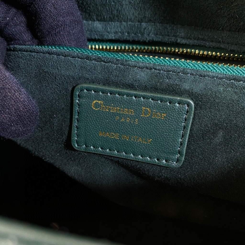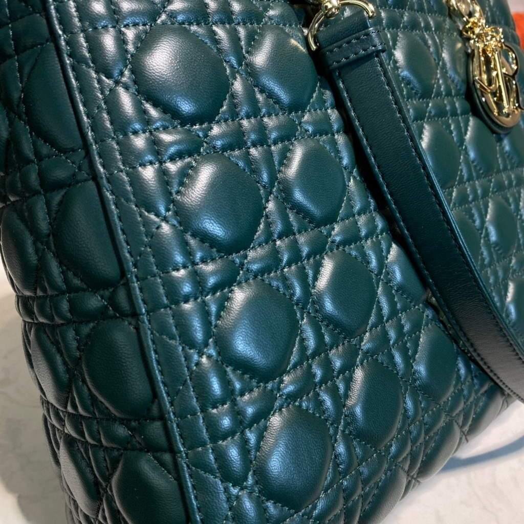 Experience elegance and functionality with the Large Lady Dior Bag. Made with luxurious Dark Green lambskin, it features a thin, adjustable, and removable shoulder strap for versatile carrying. Equipped with an interior zip pocket and large patch pocket for easy organization. Includes dust bag.