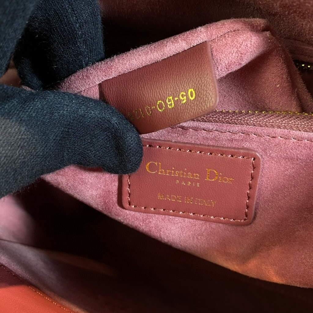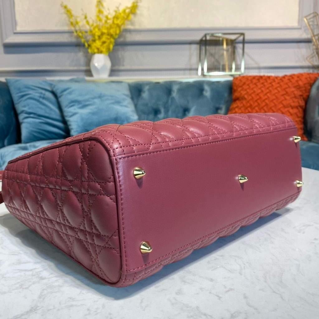 Experience elegance and functionality with the Large Lady Dior Bag. Made with luxurious wine red lambskin, it features a thin, adjustable, and removable shoulder strap for versatile carrying. Equipped with an interior zip pocket and large patch pocket for easy organization. Includes dust bag.